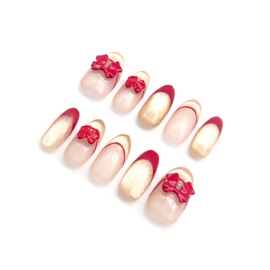 【NEW】ガーリーネイルチップ 【シャンパンゴールドマグの赤リボンネイル】