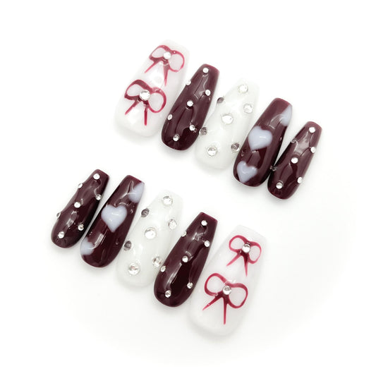【NEW】ガーリーネイルチップ 【ワインレッドのリボンドットネイル】
