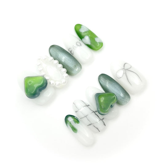 【NEW】カジュアルネイルチップ 【グリーン×ホワイトのハートネイル】