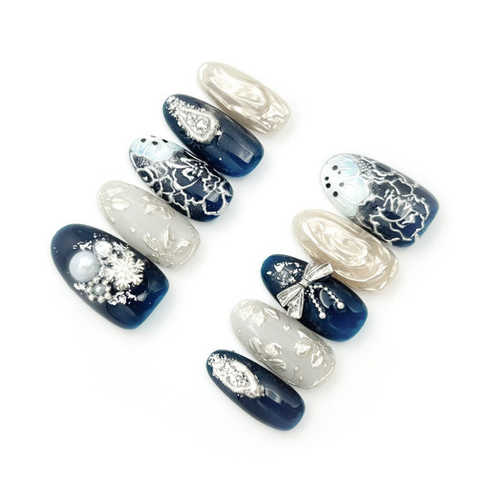 【NEW】エレガントネイルチップ 【藍色シルバーの煌めきウィンターネイル】