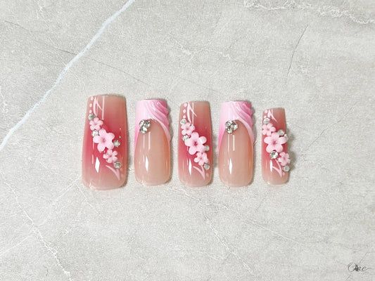 エレガントネイルチップ【華やかピンクのフラワーロングネイル】