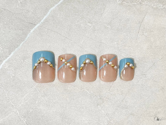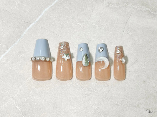 カジュアルネイルチップ【くすみブルーのデザインフレンチネイル】