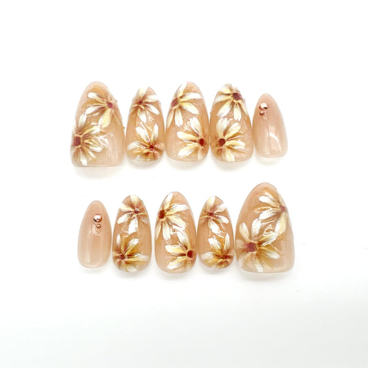 カジュアルネイルチップ【ベージュ×ゴールドの大人フラワーネイル】