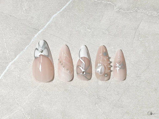 ガーリーネイルチップ【ホワイト×シルバーのキラキラリボンネイル】