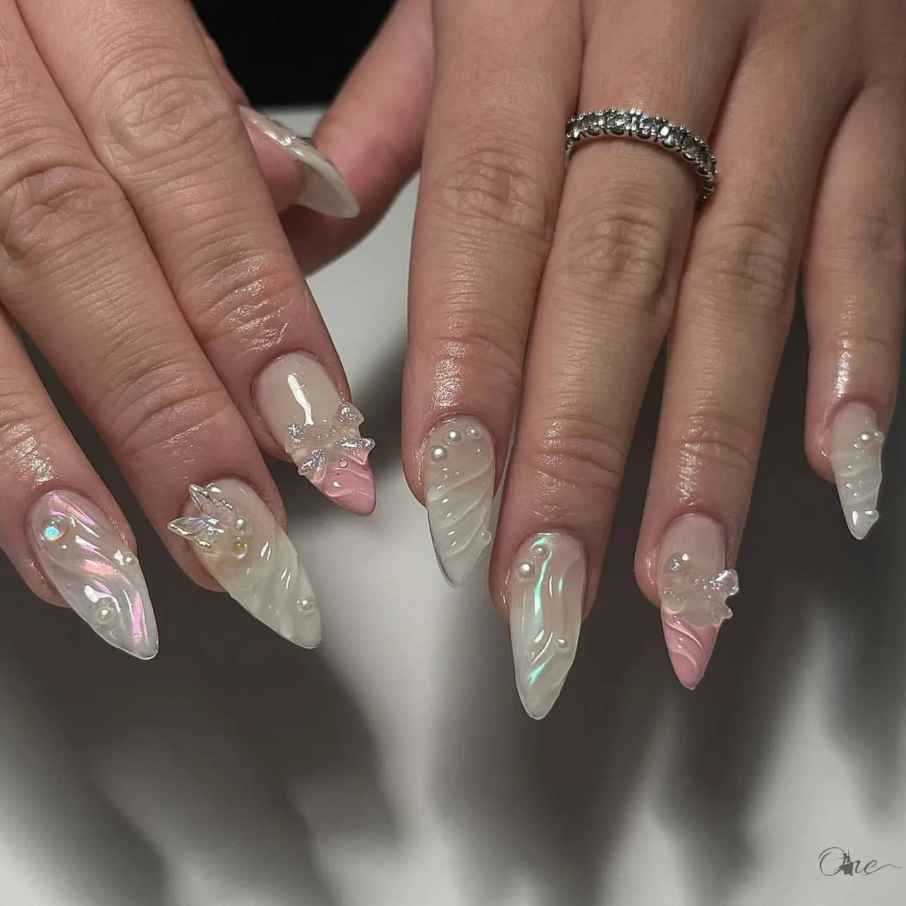 真珠のようなピュアなベースに淡いピンク色、パールを用いた3Dエフェクトとバタフライリボンのモチーフが組み合わさった華やかなデザイン。