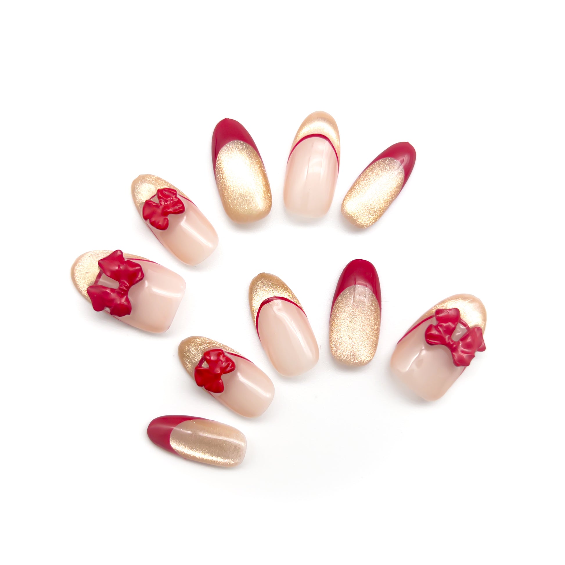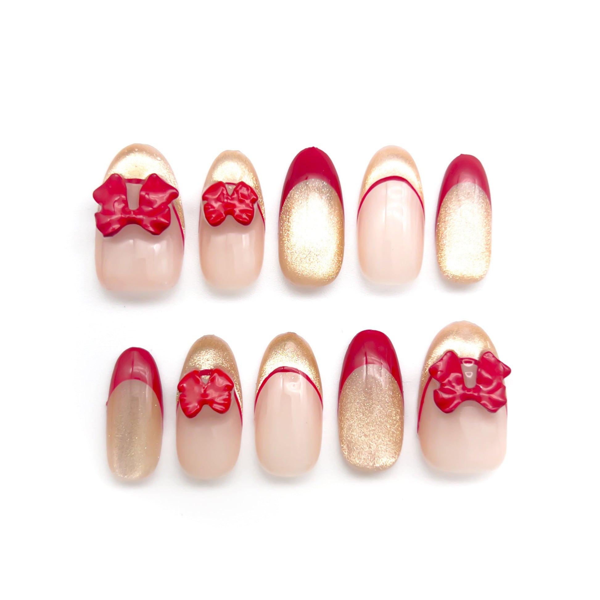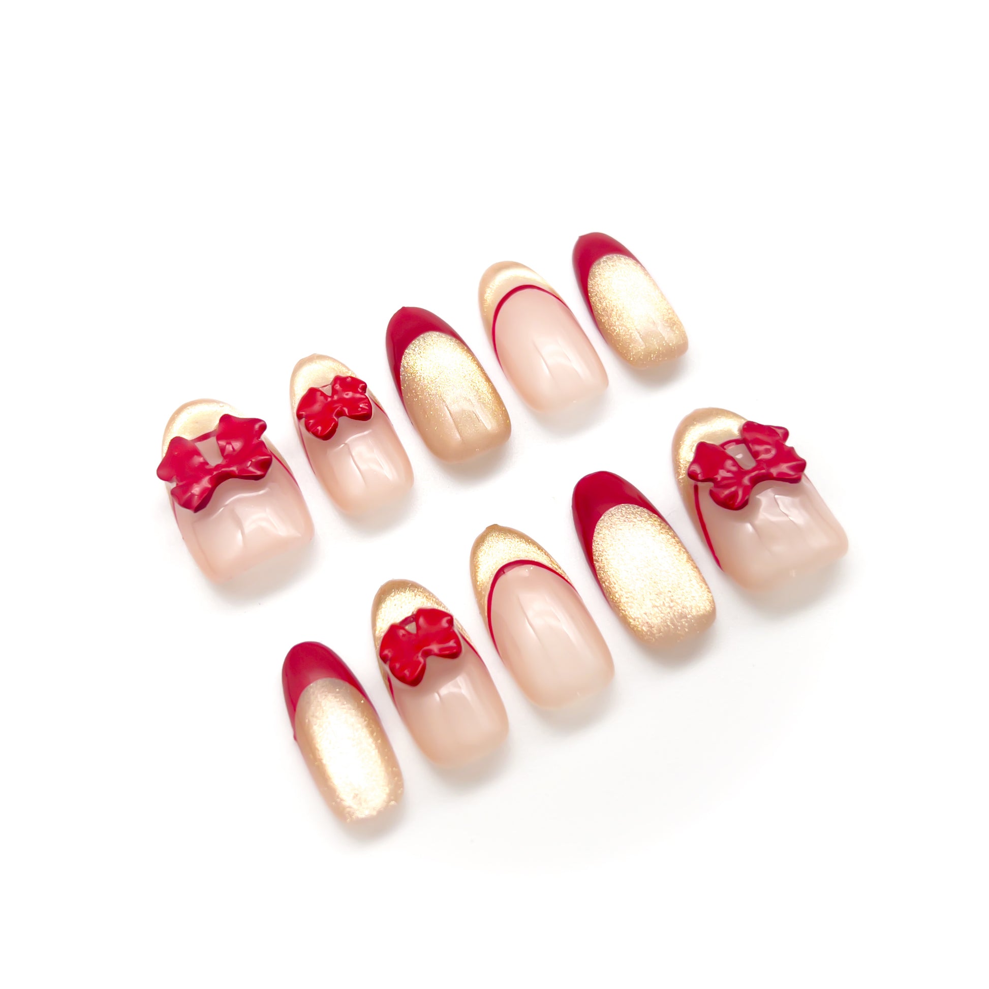 【NEW】ガーリーネイルチップ 【シャンパンゴールドマグの赤リボンネイル】